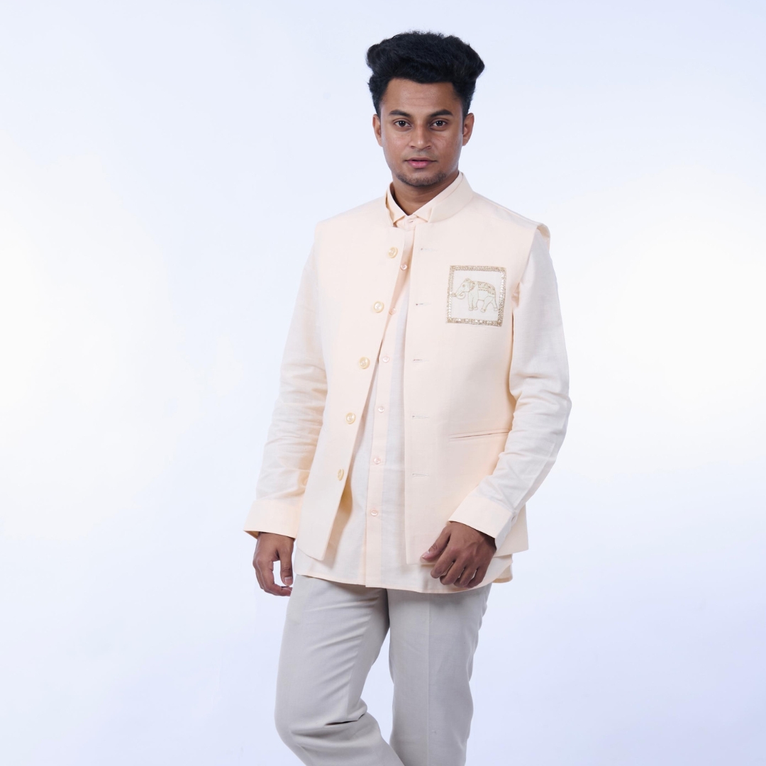 Embrace timeless tradition with this elegant Bandi with Elephant Motif for Men, crafted to reflect grace, strength, and cultural heritage. Designed in a soft beige-cream tone, this bandi features a beautifully embroidered elephant motif on the chest, symbolizing wisdom, prosperity, and good fortune.