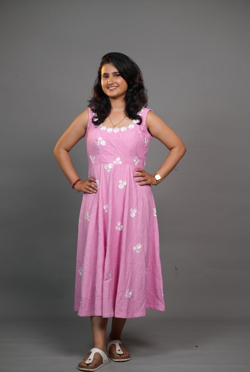 Sleeveless pink dress with white floral embroidery, fitted bodice, and flared skirt below the knees. Styled with white sandals and accessories.